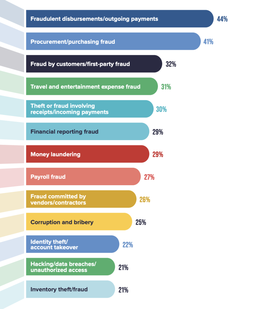 Notice, compliance officers, that bribery and corruption are far down the list, cited by only 25 percent of respondents. That number has barely budged in two years. (Although travel and entertainment fraud, along with payments fraud, place higher up the list; so maybe some respondents were conflating FCPA misconduct with those risks.)
