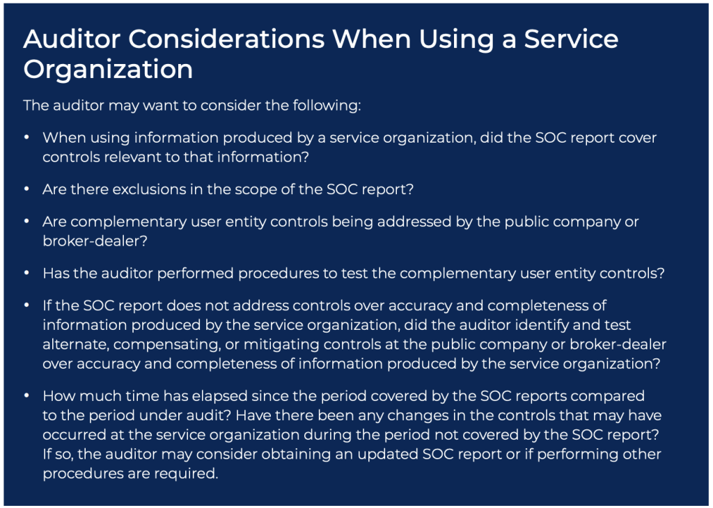 The PCAOB report also talked about “service auditors’ reports” — that is, the SOC 1 or SOC 2 reports that service providers generate, to ease the minds of publicly traded companies using those providers for help with financial reporting or data management. (SOC 1 reports provide assurance over a provider’s financial reporting controls; SOC 2 does the same for data security controls.)