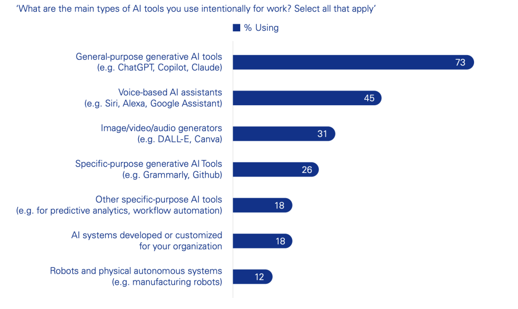 OK, not a surprise — but exactly what types of AI tools are employees using? By far and away, employees say they are using general-purpose generative AI tools such as ChatGPT or Dall-E; or AI-driven voice assistants such as Siri and Alexa. More precise “specific-purpose” tools trailed well behind. See Figure 1, below.