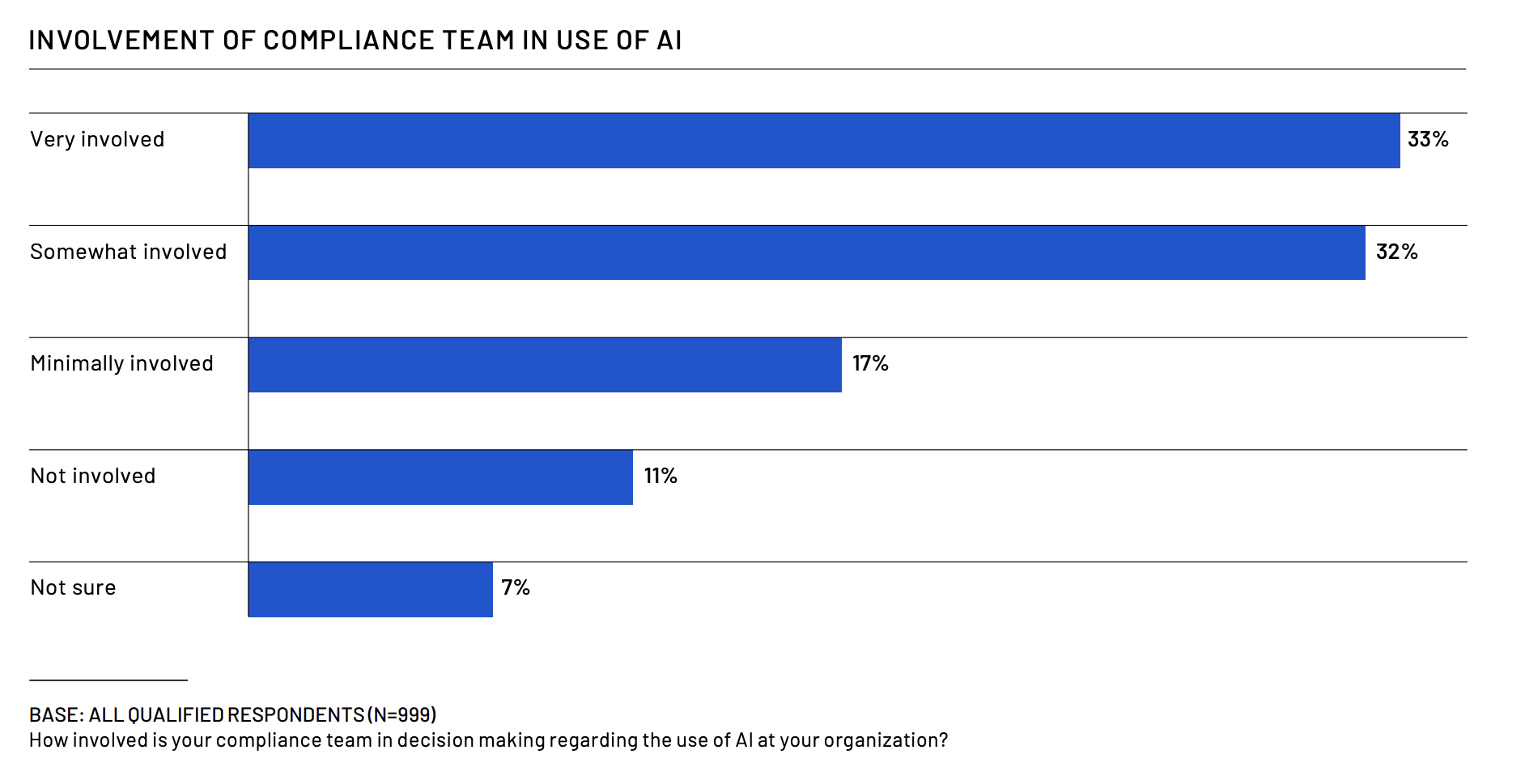Anyway, back to the Navex report, which polled nearly 1,000 compliance and risk management professionals from around the world and across a wide range of business sectors and sizes. Its key finding: that a solid majority of compliance teams are involved in deciding how AI is used at your organization.