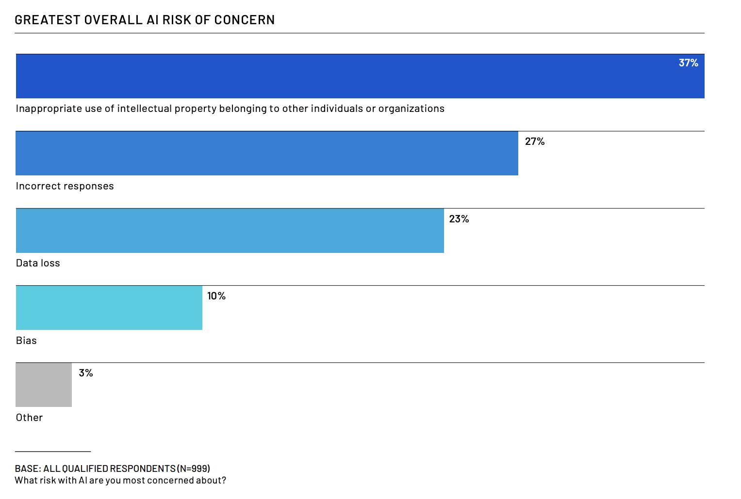 The Navex report then drilled down further into the specific AI risks that worry compliance officers right now. The top concern was inappropriate use of intellectual property or data belonging to others, by an easy margin. See Figure 3, below.