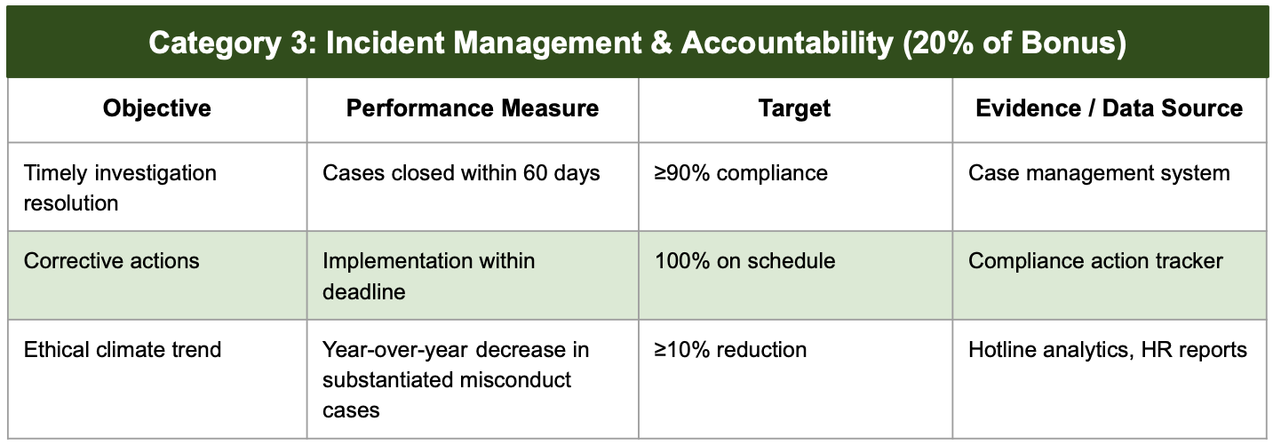 The last thing you need is HR or some senior VP arguing that, yes, Executive X has met some compliance objective and therefore deserves a bonus, when you believe Executive X hasn’t. Ideally your incentives framework will include as many specific, objective, data-driven performance measures as possible; but anticipate the potential for disagreement and what a resolution process for those disagreements could look like.
