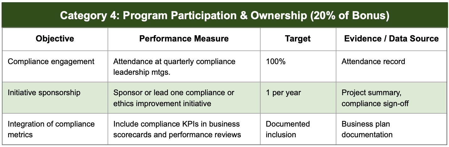 Second, think strategically about how much of an executive’s total bonus will be tied to compliance criteria.