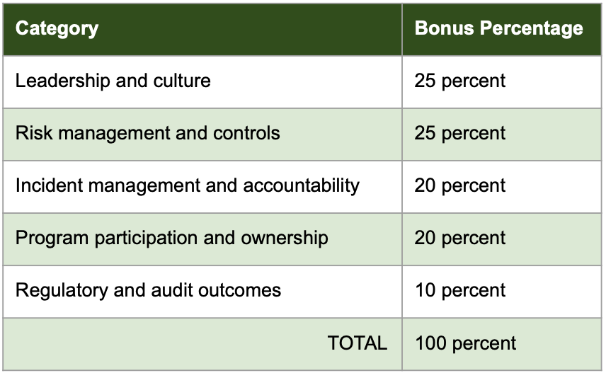 Each of the five categories also counted for a certain percentage of the total bonus amount. For example, leadership and culture accounted for 25 percent of the bonus, while regulatory and audit outcomes were only only 10 percent of the bonus. In theory, you could design your incentives program so that all five criteria were each worth 20 percent of the total, but I’m not sure that would ever make sense. For most executives in most industries, leadership does matter more than regulatory outcomes; so yes, you’d want to skew your incentive structure toward that category.
